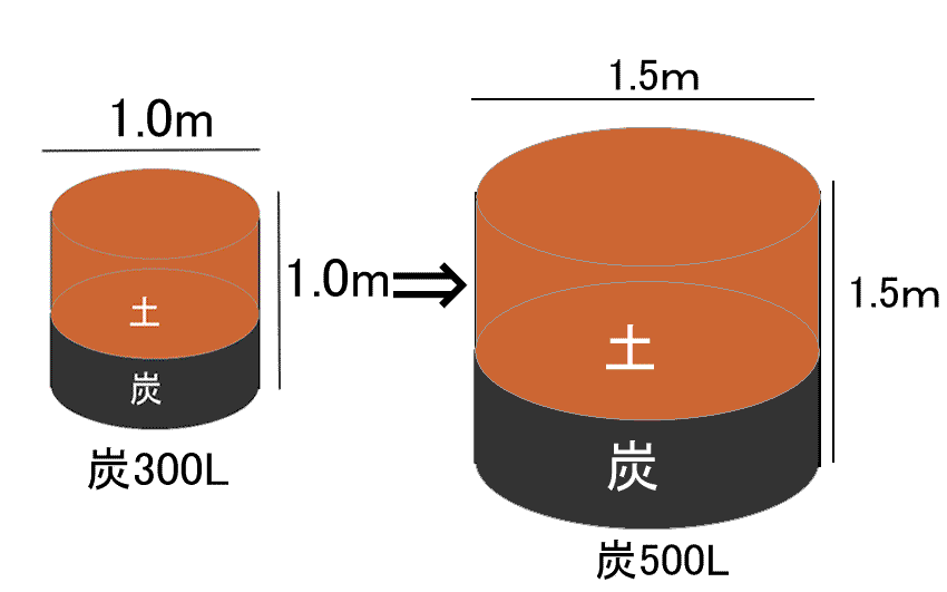 埋炭の木炭の基準量は300Lですが土地の状態やどのようないやしろち化にするかによって