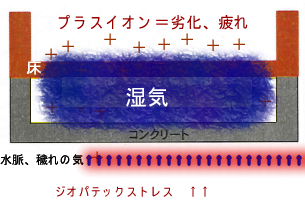 床下に炭を敷き詰めることで湿度調整の他、床部分からのぷらすイオンをマイナスイオンに変換することができます。
